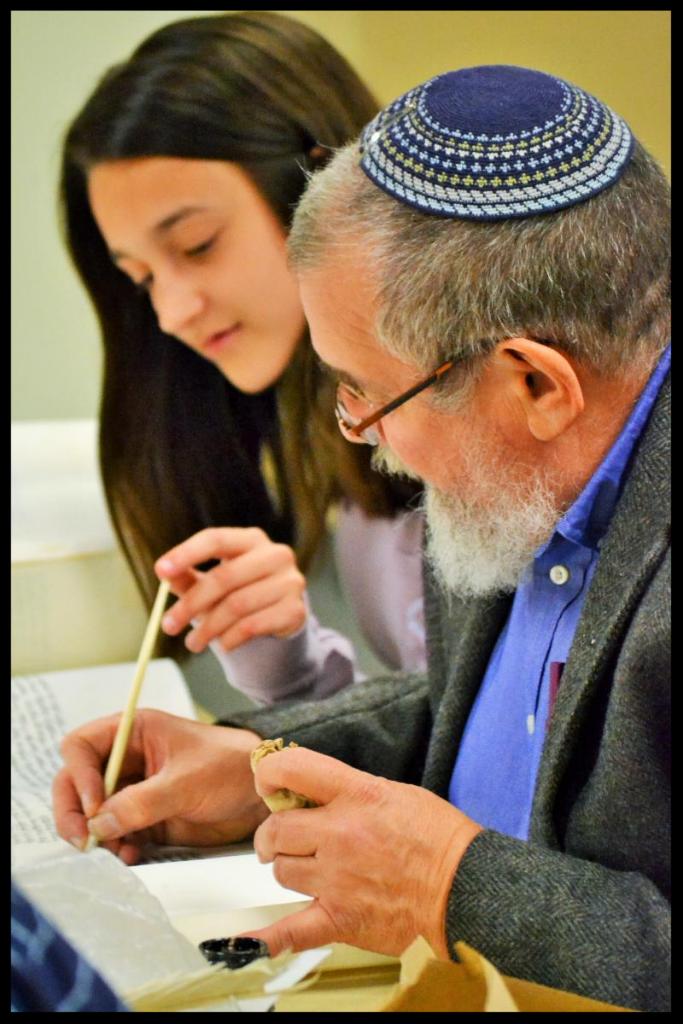 Rabbi Zerach Greenfield, from Israel, was the Sofer (Scribe). Among the laws and interesting facts he shared included the following: the Sofer must use a feather and use special ink; there are about 305,000 letters in the full Torah; a Torah scroll may only be written on parchment from the skin of a kosher animal; before beginning to write a Torah scroll, the scribe must mark off the lines (scoring) on the parchment with slight grooves; no letter must touch another letter; a computer scan is used to make sure that all the letters are included, are in the proper place, and that no mistakes have been made; and much more!